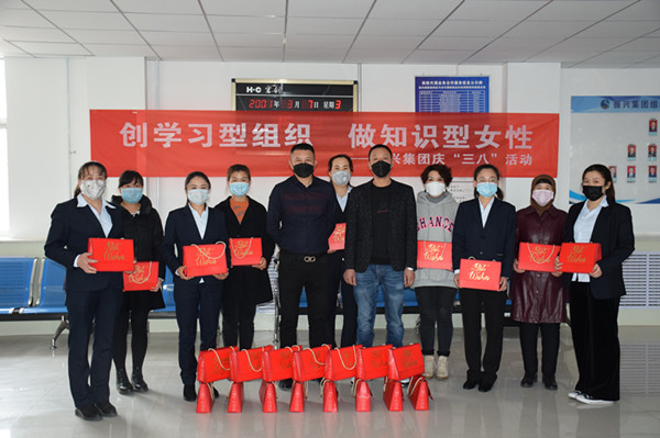 在慶祝三八婦女節(jié)儀式上,集團(tuán)公司副董事長(zhǎng)鄭龍和副總經(jīng)理蘭小偉為全體女職工發(fā)放了福利并合影。